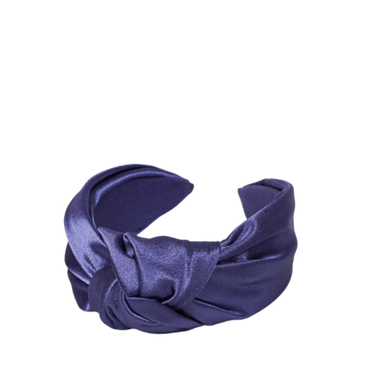 Tummansininen kiiltävä satiininen hiuspanta tyylikkäällä solmuyksityiskohdalla.